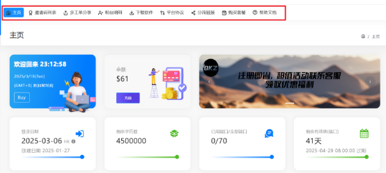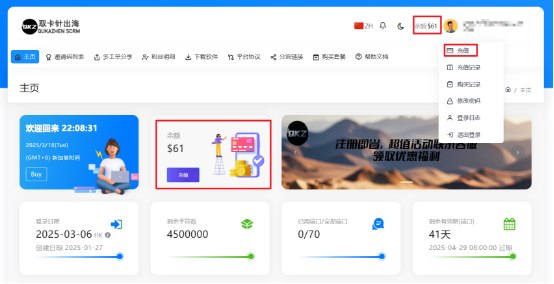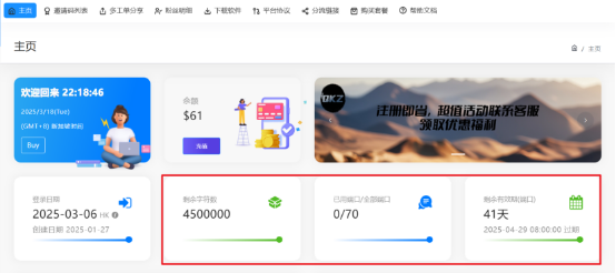 后台管理后台首页本页总览SCRM主页 包含 数据 进粉 端口 字符 到期时间 APP下载,首页展示 账号余额 后台首页详细显示 【账户余额】,客户可根据套餐金额,和自定义金额,进行充值(点击头像可进行充值) 套餐信息 后台首页可直接查看,【字符】剩余数量,和【端口】使用情况,以及端口有效日期! 首页功能 附加说明 1. 字符数套餐不限时间(用完为止),到期时间对应是端口日期! 2. 进粉统计和APP统计是整个账号下面的APP和邀请码下APP联系人。