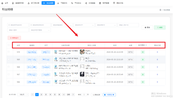 可显示【邀请码】--【APP】--【账号】--【粉丝数据】--【时间】--【来源】--【重复】--【跟进记录】