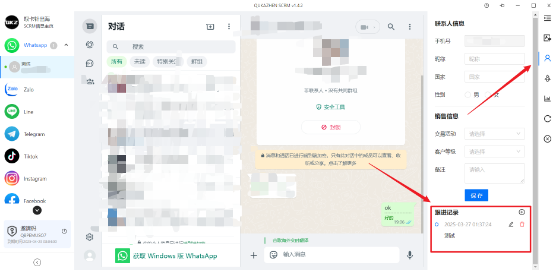 - 登录客户端,登录账号,找到联系人---【右侧人物】---可设置---联系人【跟进记录】