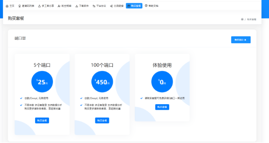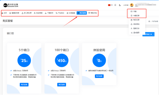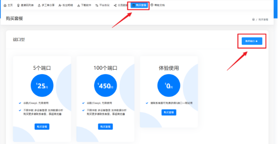 充值之后,点击上方--【购买套餐】--进行端口购买!!!