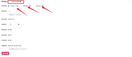 勾选自动续费:当时间剩余3天时,则进行原端口数量自动续费,要保证余额充足!